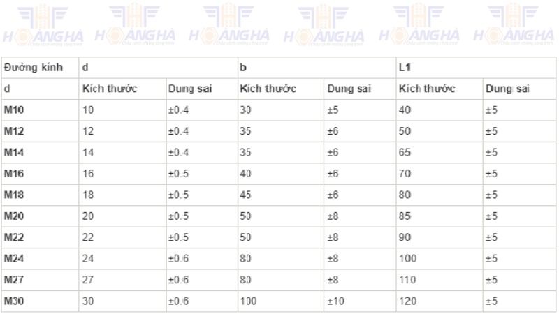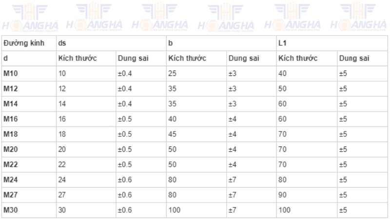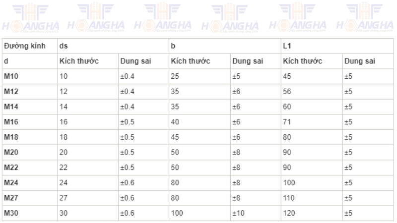 Bảng tiêu chuẩn kỹ thuật của bu lông neo móng