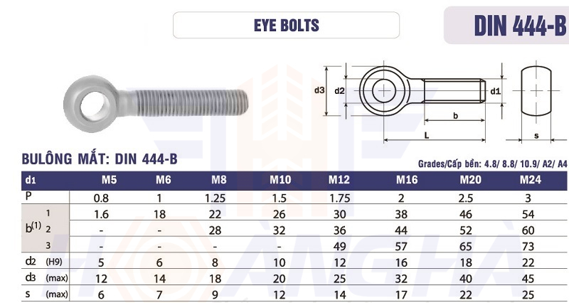 Không sử dụng quá nhiều, nhưng bulong mắt inox cũng được sản xuất theo một tiêu chuẩn nhất định để có thể đưa vào sản xuất hàng loạt với số lượng lớn, nhằm giảm giá thành sản phẩm. Hiện tại thì chủ yếu bu lông mắt được sản xuất theo tiêu chuẩn Din 444, tiêu chuẩn của Đức. Dưới đây là bảng thông số kỹ thuật của bu lông mắt: